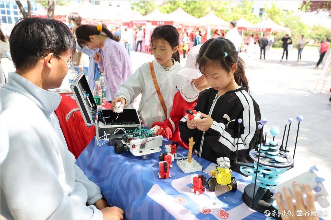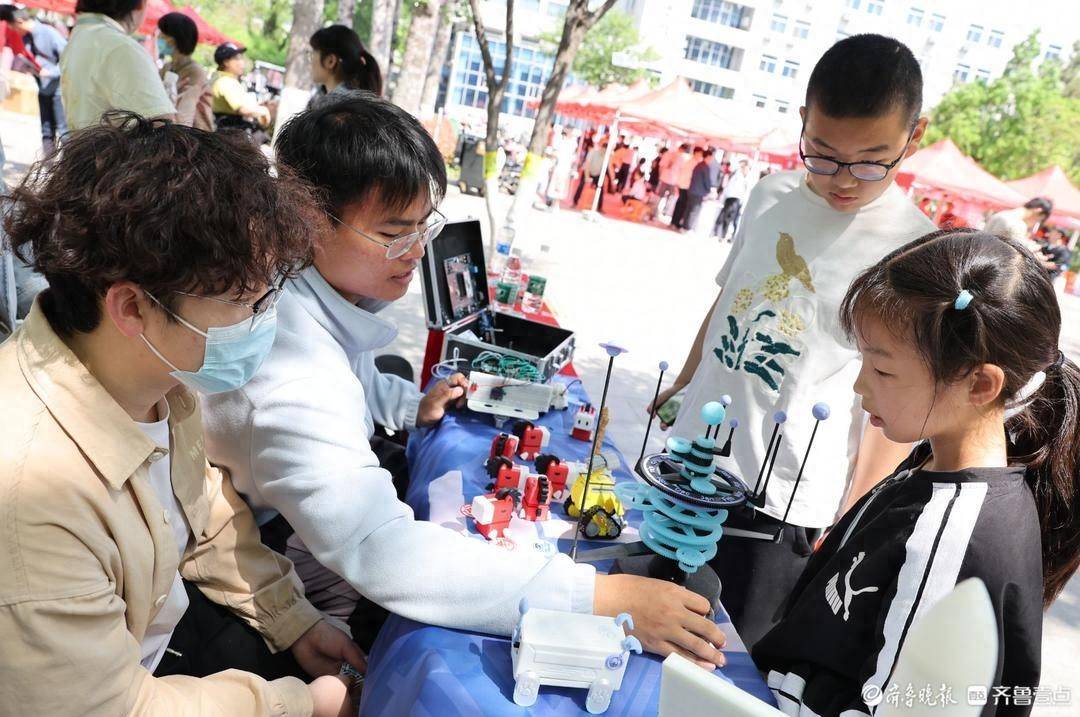 在活动现场,来自山东大学科创社团"极客小组"的同学们,带来了精心制作的行星运行模拟装置、3D打印贺岁小马、小机器人瓦力、寻迹小车、机器人“比特小狗”等科创作品现场展示,吸引众多家长和小朋友驻足围观,成为咨询会现场人气最旺的展区之一。